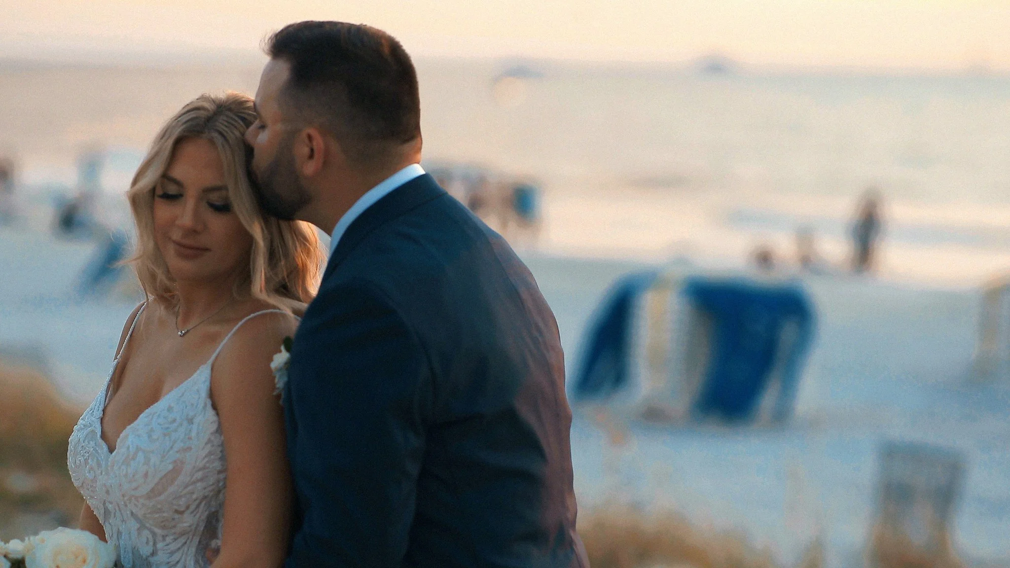 As the evening light softened across Clearwater Beach, the couple stepped onto the sand for sunset portraits. The golden Gulf light created a warm romantic glow that made their beach portraits feel effortless and timeless.