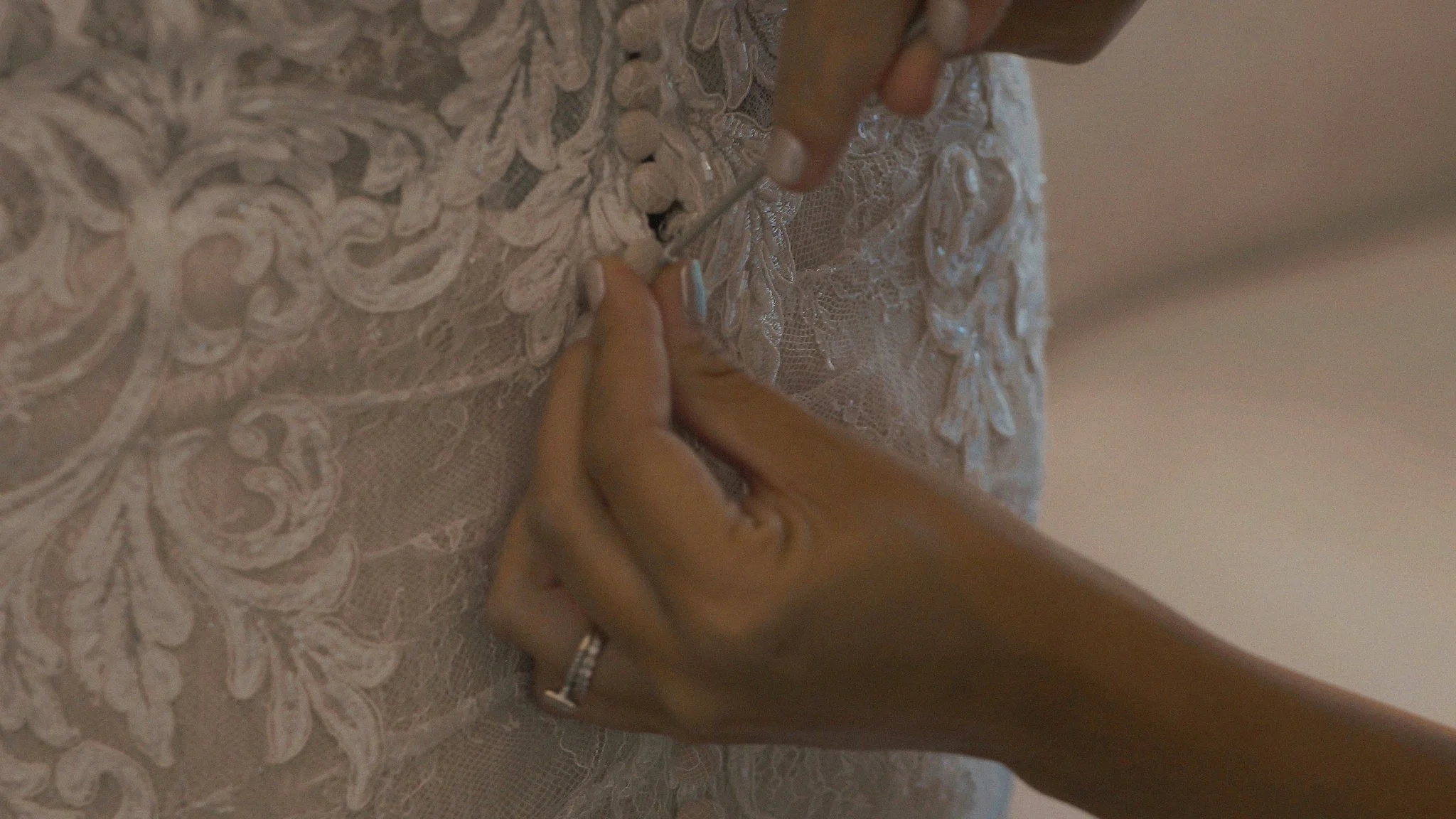 Lighting plays a huge role in preserving the look and feel of a wedding film. For Lauren’s preparations, we actually closed the curtains and moved her into softer diffused light to preserve the details in the dress and avoid harsh lighting.