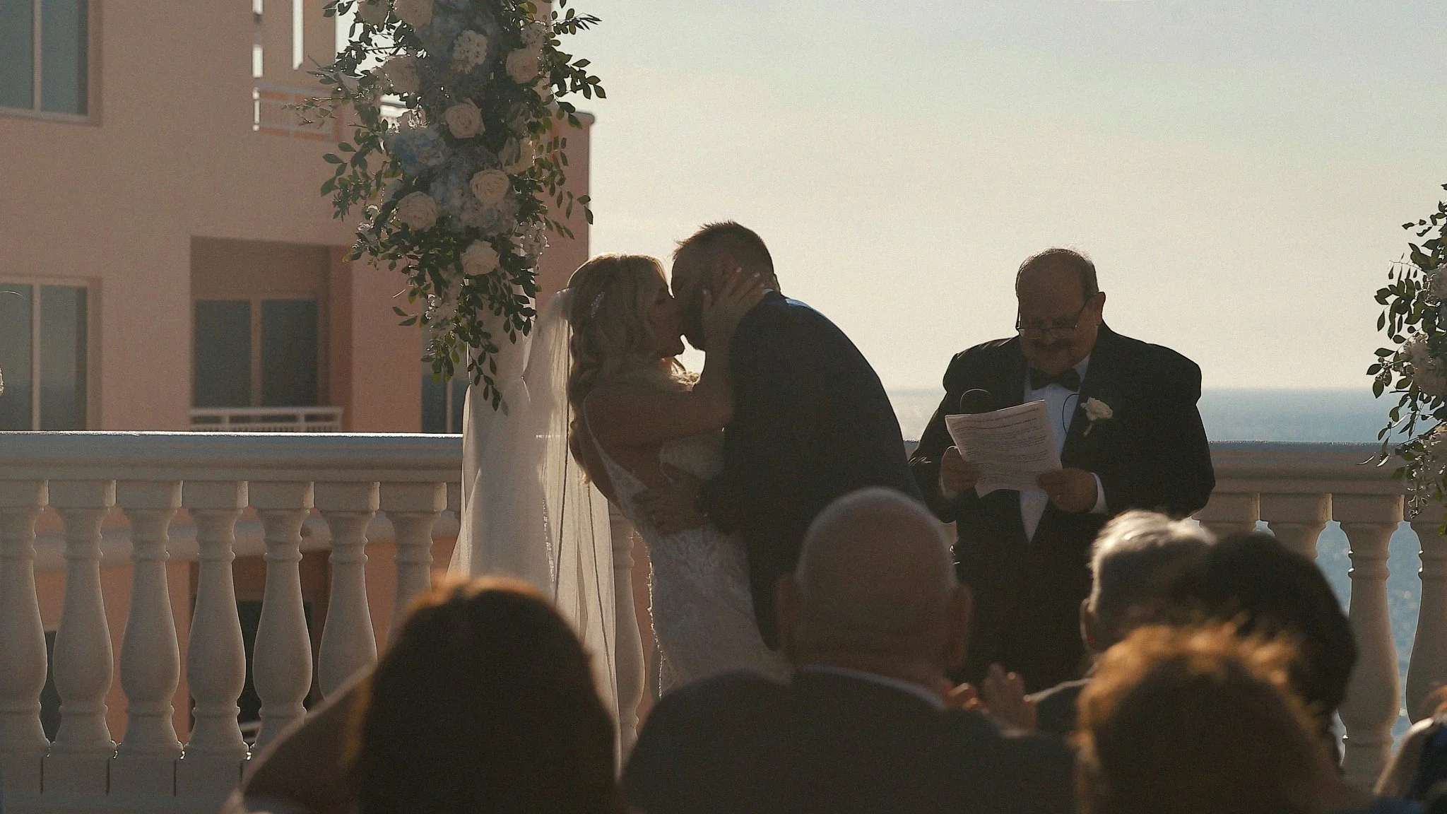 Lauren and Cliff exchanged vows on the terrace overlooking Clearwater Beach and the Gulf of Mexico. The elevated view from the Hyatt Regency terrace creates a beautiful ceremony setting, where the Gulf horizon becomes the natural backdrop.